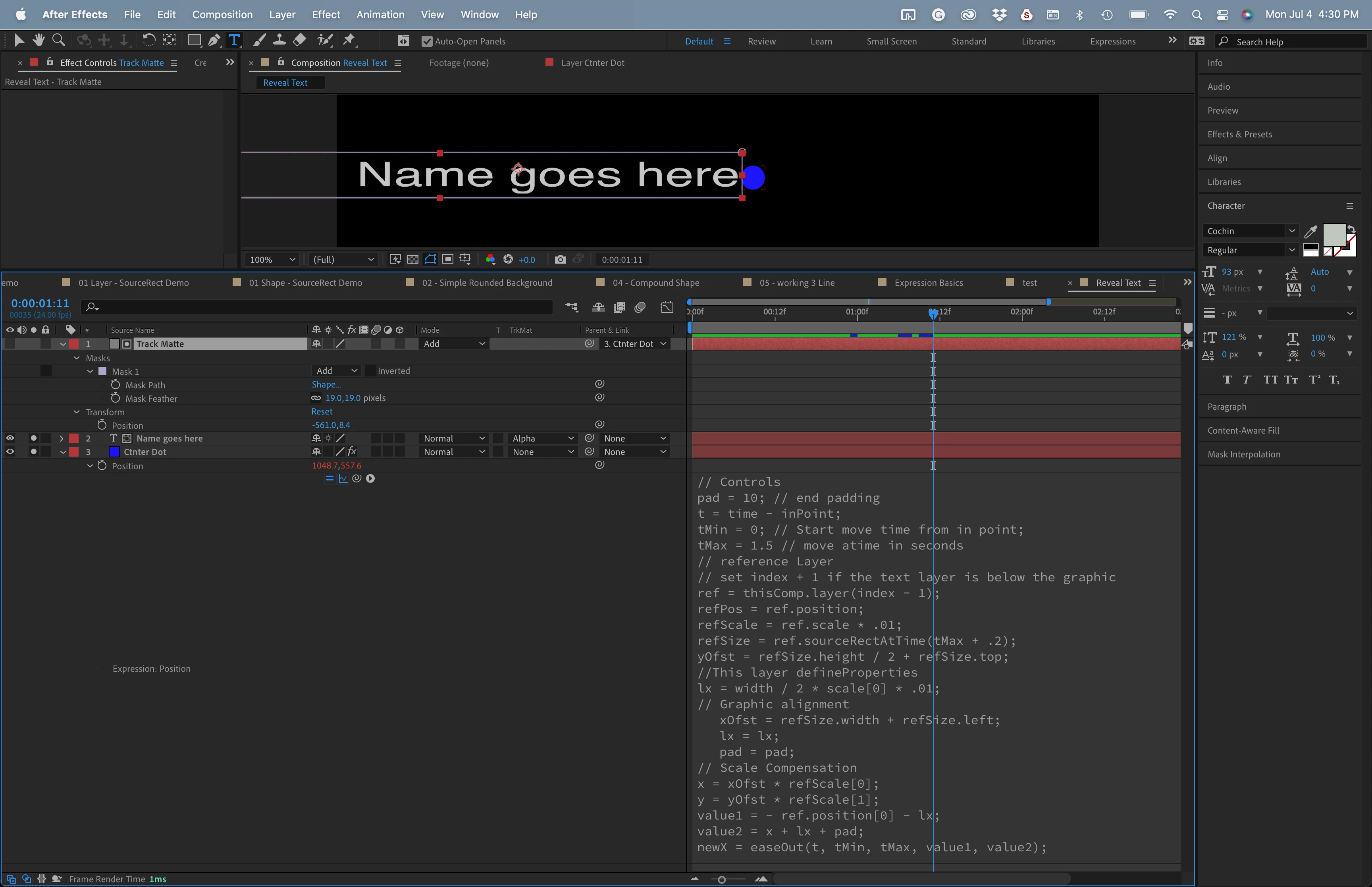 I linked the Null 2 layer to Transform Call, which is the layer that moves the logo to the right. I was hoping to link a mask on the text layer to the Null layer's movement so that the mask would follow the logo's movement, but I wasn't able to do that.