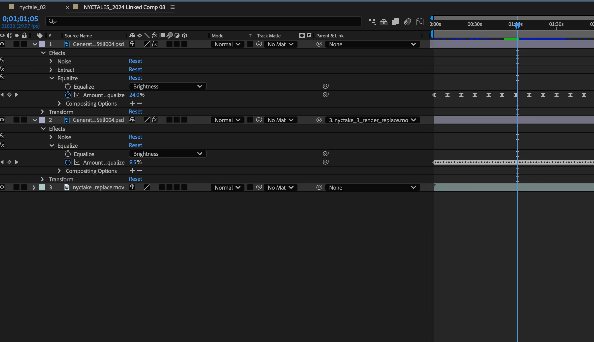 I should try luma matte. I manage to get interesting result extracting the white in the still frame and then with equalize and wiggler generating variation of the amount of equalize over the brighness. But still, it's not in synk with the light variation in the video. There must be a way to trigger the equalize from the level of light in the underneath video.
