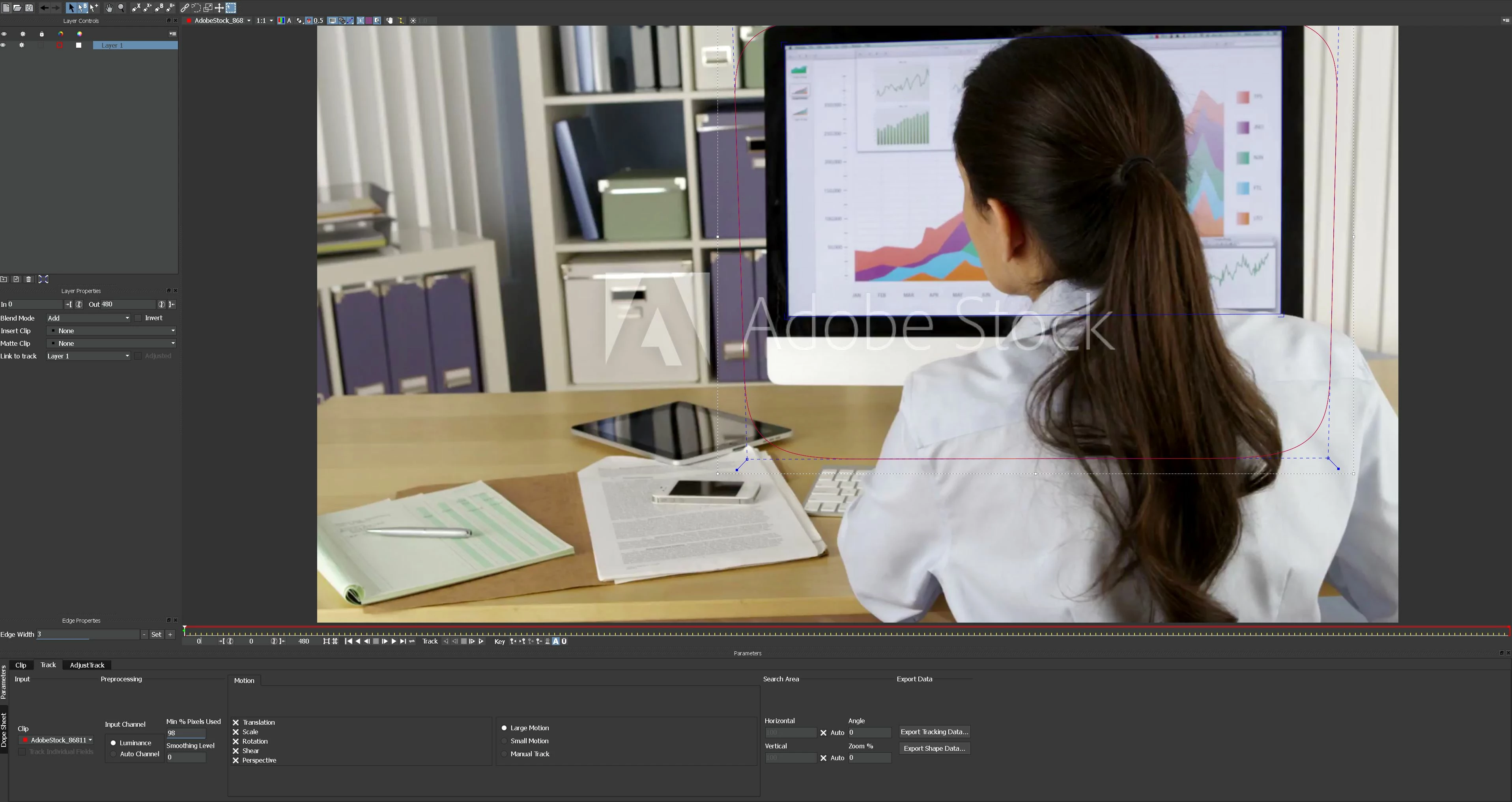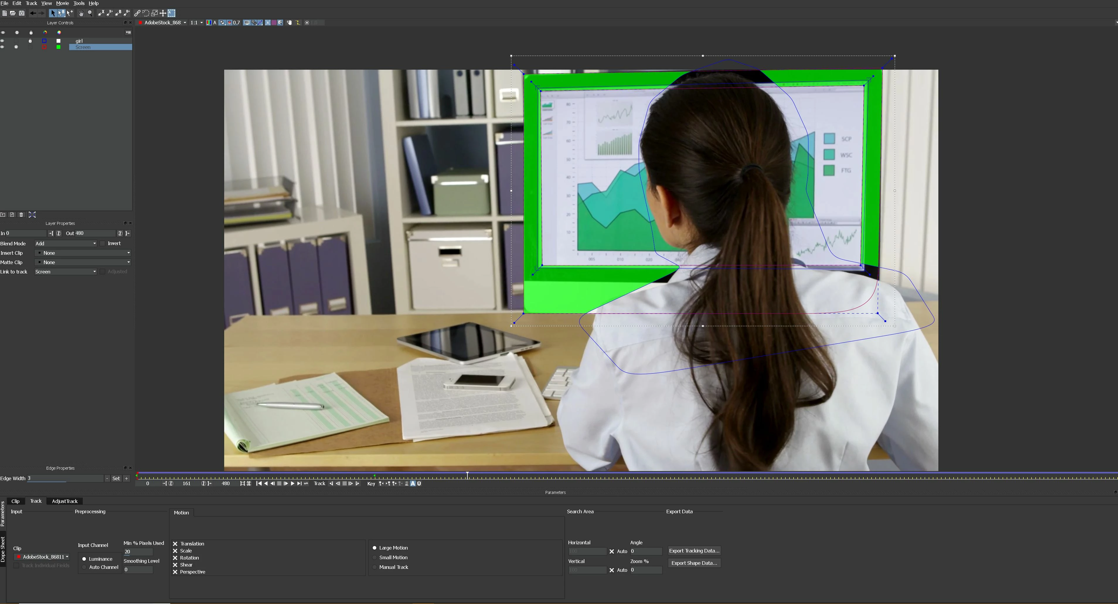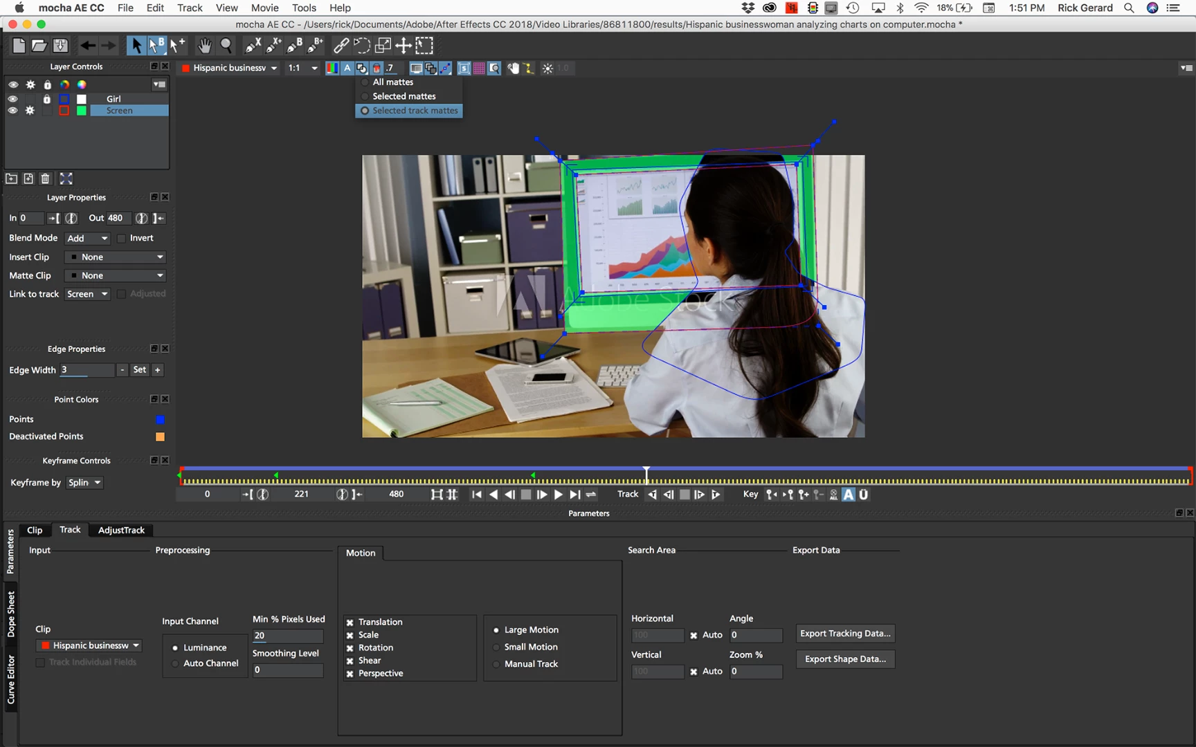 You will also need to roto the girl so you would probably be better off tracking the girl and exporting a matte for her, but that is another lesson. You can find good tutorials on the Borris FX site that will help you create a decent matte for the girl. If you have a reasonable machine and have the technique down the Mocha work will probably take you about an hour.