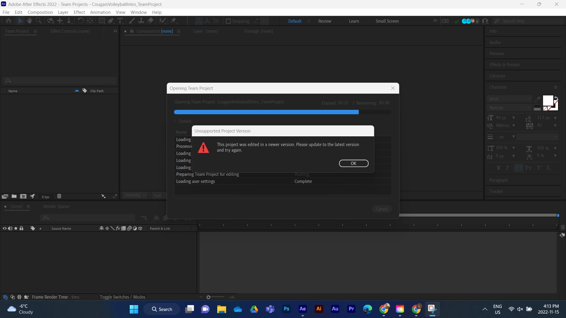 Hi, there! I keep having this error when trying to load a teams project.