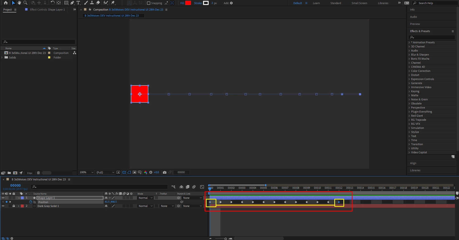 In my example, I made a keyframe on the first position, and then each time I moved the shape, and added a keyframe manually, until the last frame. So if I make a keyframe on the first and last position in the timeline, is there a method AE can create the in between keyframes, so I dont need to do this process manually?