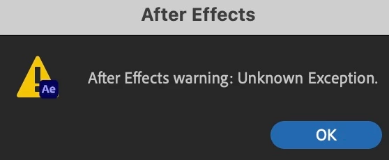 Kkamille53Known ParticipantForum|Forum|4 years agoNovember 30, 2021QuestionUnknown Exception??Forum|Forum|4 years agoNovember 30, 20210 replies554 viewsI am running 2017 iMac. I recently upgraded to AE 2022 and MacOS Monterrey. AE is more buggy than usual.I keep getting this error. See Attached.Error or problem