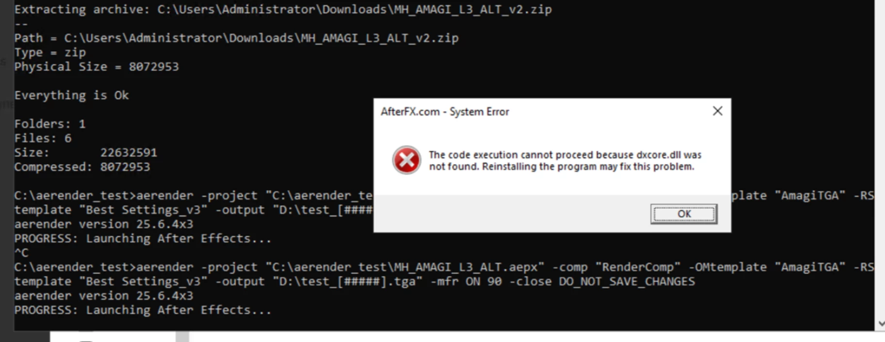The issue is that aerender commands or after effects 25.6 or 26.0 is not opening with popup of dxcore.dll not found, I have already installed latest