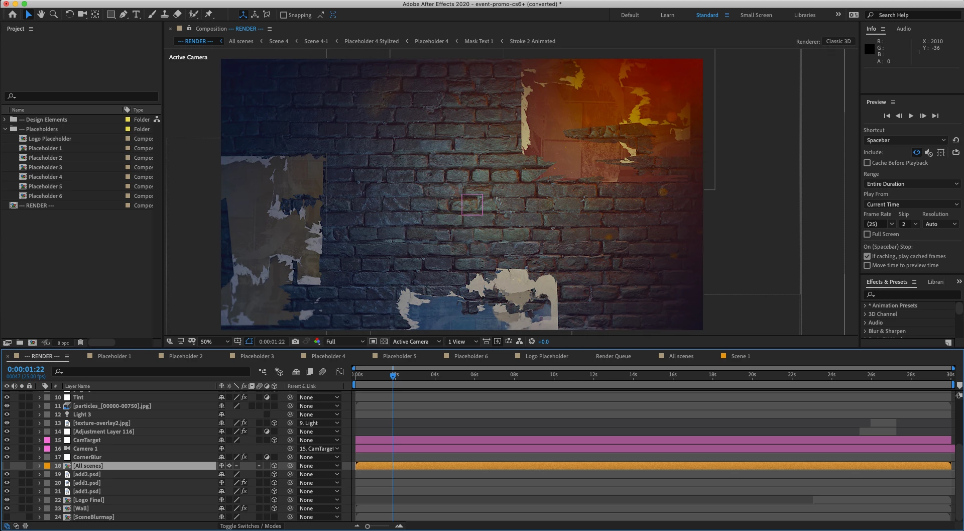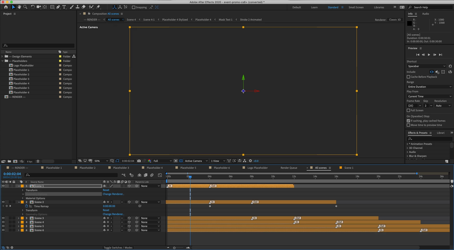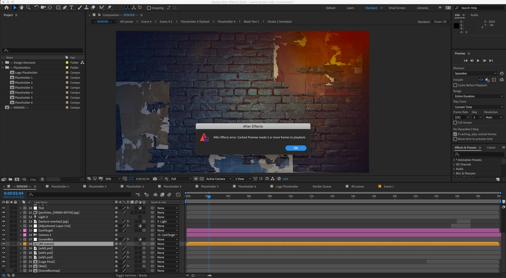 I'm having a problem getting my After Effects to run a template I downloaded. Everything seems to work ok in the project until I activate the "ALL SCENES" comp. I then get the warning message saying Cached preview needs 2 or more frames for playback.