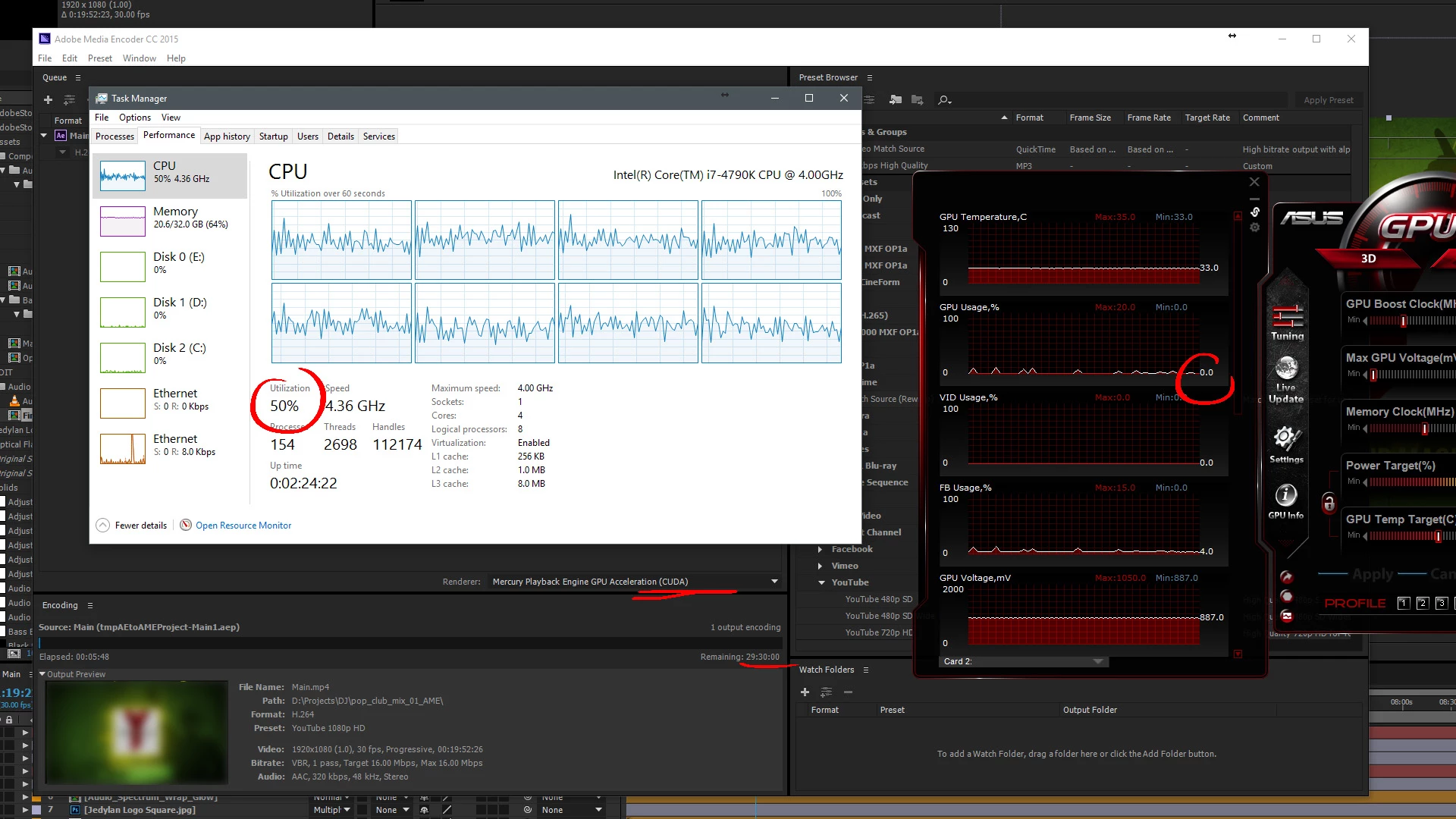 The GPU is not used for rendering 99% of everything that AE does. If you use the AME to render a comp from AE then AE runs in the background so AME has to leave some resources for you to do other things. Using AME is always slower than rendering with the Render Cue if you are going to the same format but for most of us this is not a problem because we don't sit around and wait for renders, we work on the next shot or move to another project. That's the advantage of the AME, you never have to stop creating - the stuff you get paid for. If it's a rush to get the project out then render with AE's Render Cue to a fast rendering production codec and then run that through the AME because AME is much more efficient and faster at transcoding video to another format.