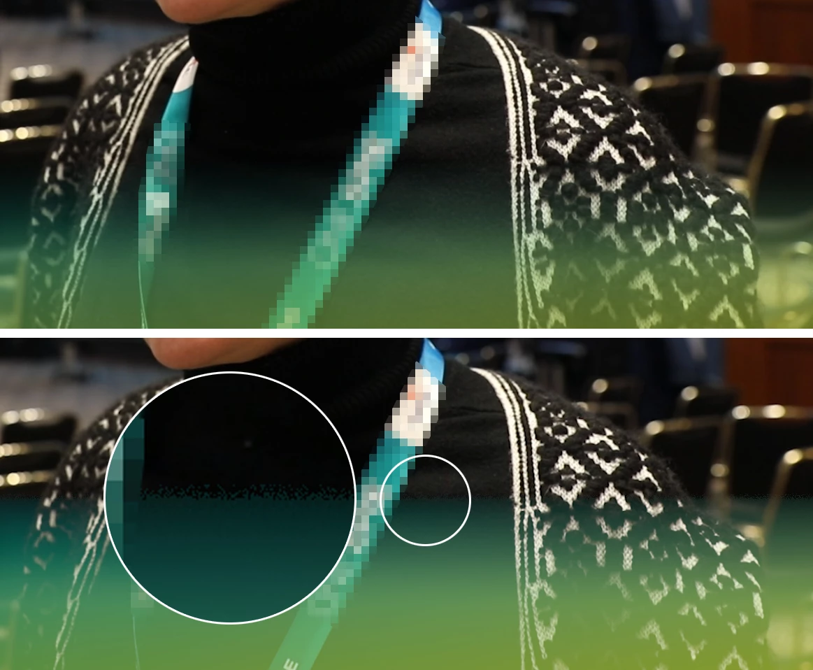 Ersetze ich nun in Premiere einen Clip durch eine AE-Komposition, bekomme ich den sauberen Verlauf (im Bild oben). Exportiere ich hingegen die Bauchbinde jedoch in Essential Graphics, um sie in Premiere mehrfach zu verwenden, so bekomme ich einen harten, im Detail pixeligen Übnergang (unten). Wer kann sich - und mir - das erklären?