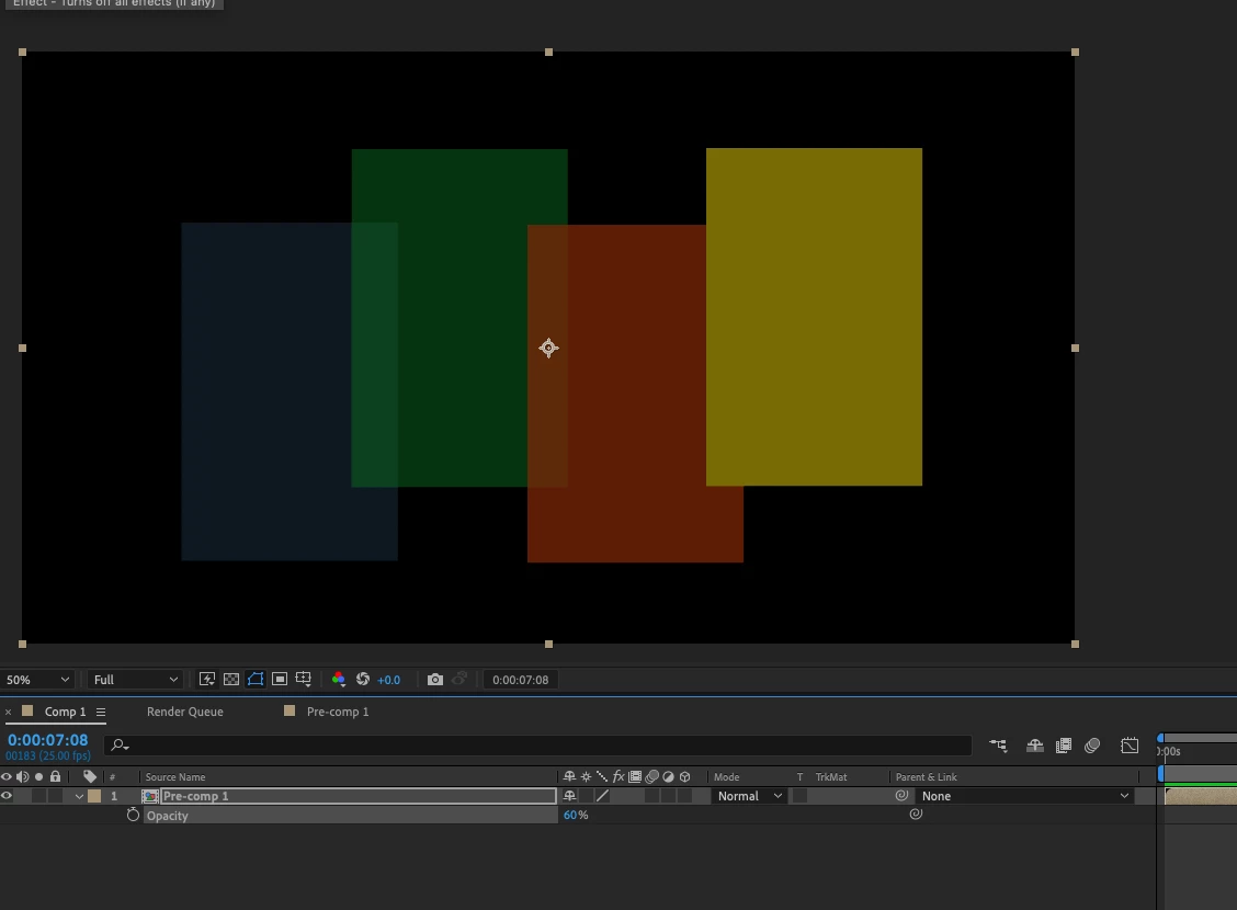 Of course, if I turn that switch off, AE lets me adjust the opacity of all the layers within the comp, but not my comp is blurry because it’s not being rasterized…
