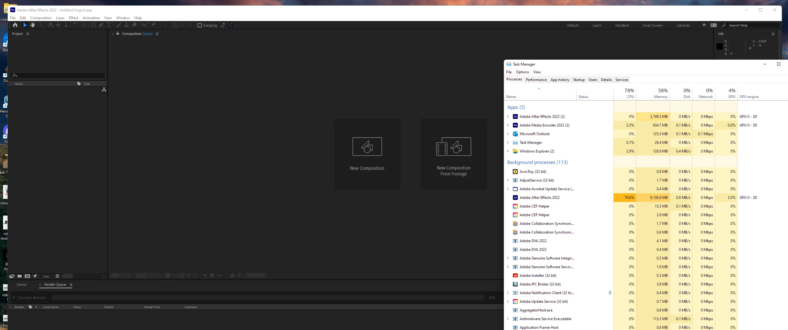 So, I had to reinstall the most recent version of AE because Premiere 2022 wont work with old versions of AE. Wonderful. AE is using 8 Gigs of Ram, and running  the CPU up to 70-100% being open with no project open. It even spiked the GPU a couple times to 100% while doing nothing.Still haven't seen a response from adobe on this.
