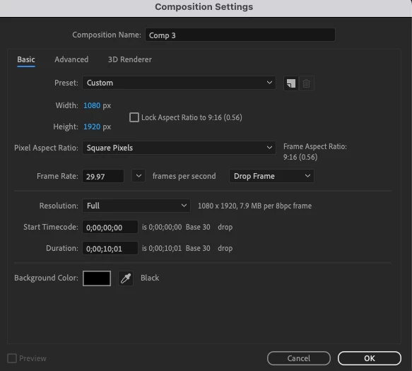 I have attached the composition settings if that helps at all but probably has nothing to do with it.