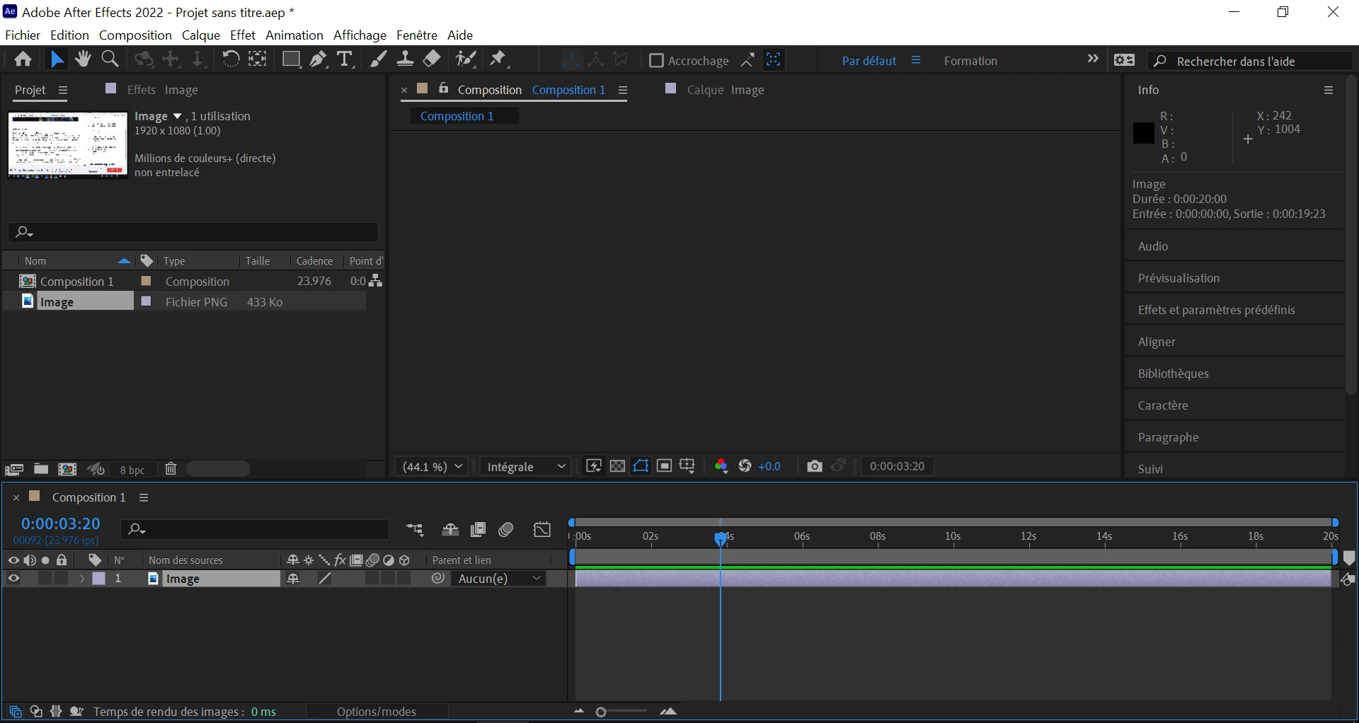 I have a problem with After Effect (v. 22.01): I open a new, blank project, create a 1000x1000px composition, and when I insert an image into my timeline it does not show up in the panel where I used to see it. I am not a beginner in AE, and have already used it before without any problem; it seems to me that it is since the 2022 version that this happens. Here is a screenshot (I have a french pc so AE is in french) :