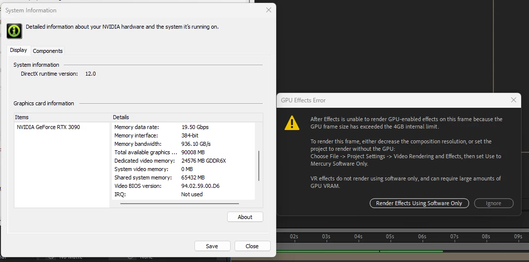 After effects is unable to render GPU-enabled effects on this frame becuae the GPU frame size has exceeded the 4GB internal limit."