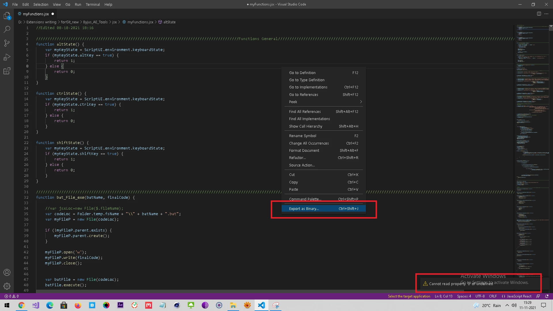 Am trying to export Jsx as binary from VScode(extendscript extension installed). But when i try to Export jsx as binary it is giving an error saying "cannot read property 0 of undefined"
