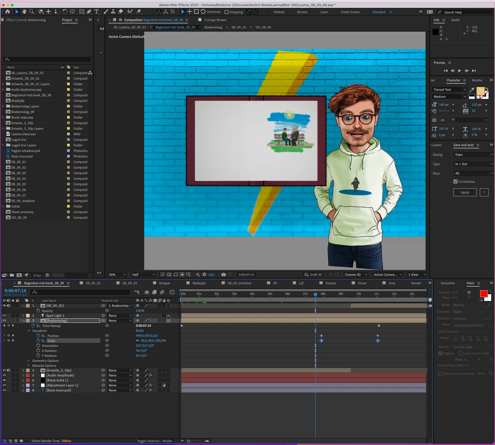 Oh I forgot to add a screenshot of the precomp of the book. Here it is. Just some rotation keyframes on the cover, back and pages. They're parented to the back of book, so I that as a handle to move the book around a little.
