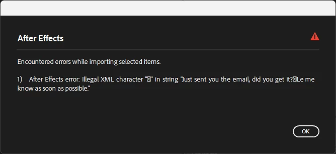 There's some kind of messed up stuff going on. I needed a simple text animation from another project. I reduced it down to just that comp plus a few pngs. After importing it into the main project I get this message.