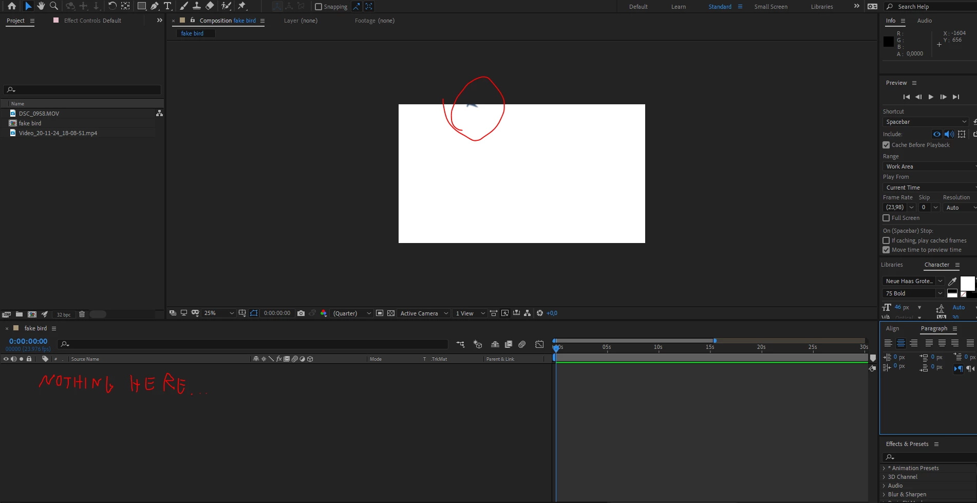 I hope someone can help me. I really don't know how to look for a solution for this problem as I don't know what the heck happens. Recently I worked on a video and made a mask from a bird flying across the sky. Since then I keep getting a piece of this bird in every composition I make and even in new projects. Its kinda just stuck to After Effects and only visible when there is no other layer visible at the moment. So it's not a super huge deal as I can easliy 'cover it up' but I still would really like to know what that is and how I can get rid of it. Hope that someone knows ehats up, thanks already in advance! 🙂