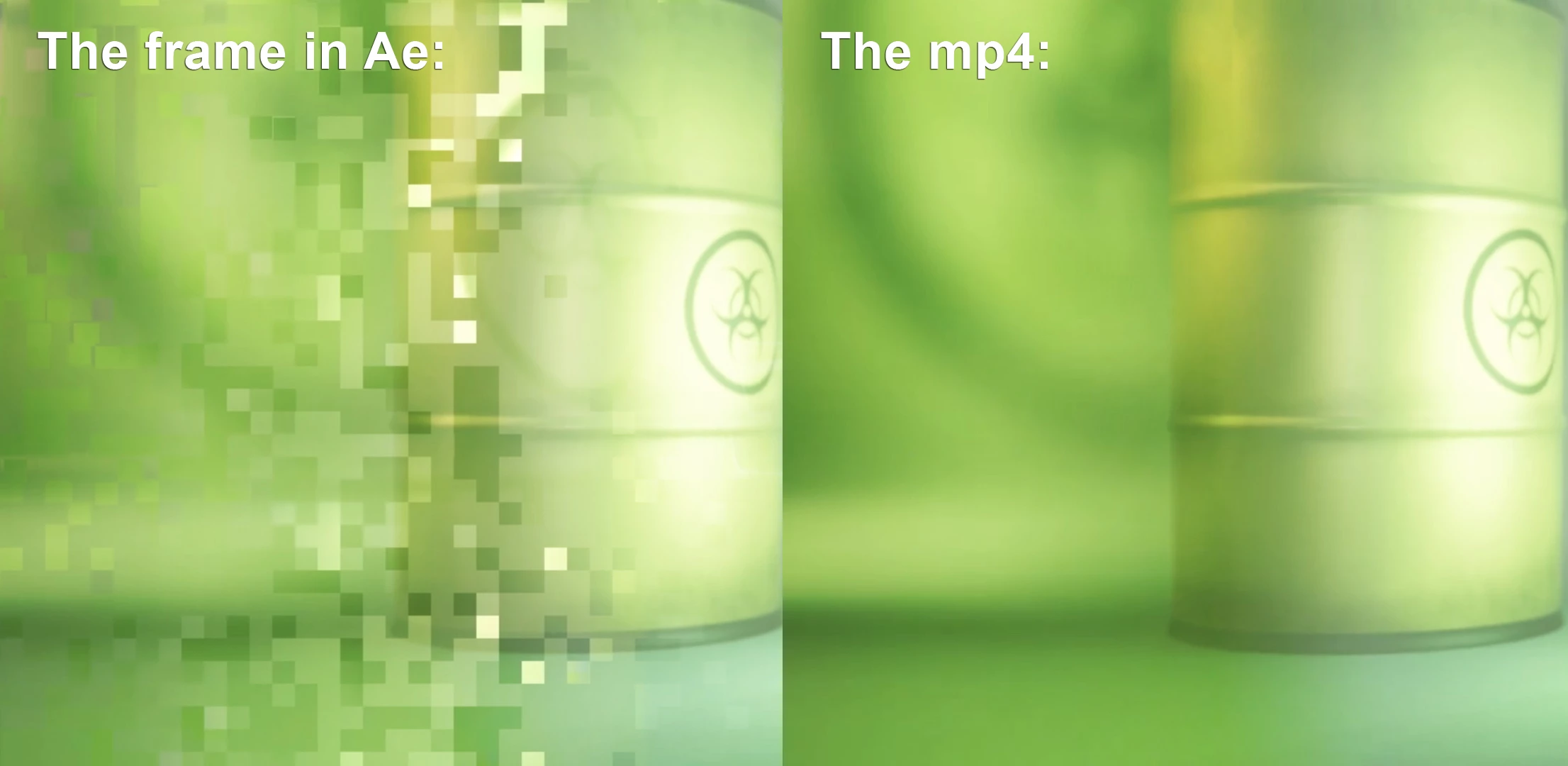 I want to render a project I've been working on, but lately, After Effects creates all kinds of weird glitches. This glitch even gets rendered, which is a problem of course. In After Effects the frame gets very pixelated. At first, I thought the problem was in the mp4 render. But the mp4 looks fine and smooth. I already imported the mp4's again, re-linked them, reloaded, etc, but After Effects keeps destroying some of the frames. (see example below)