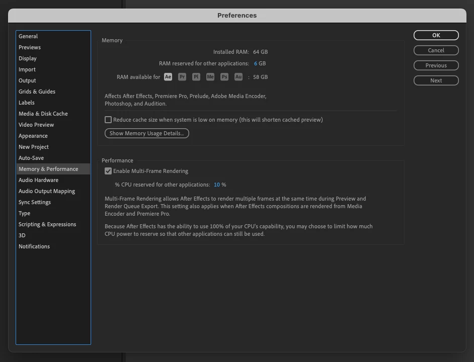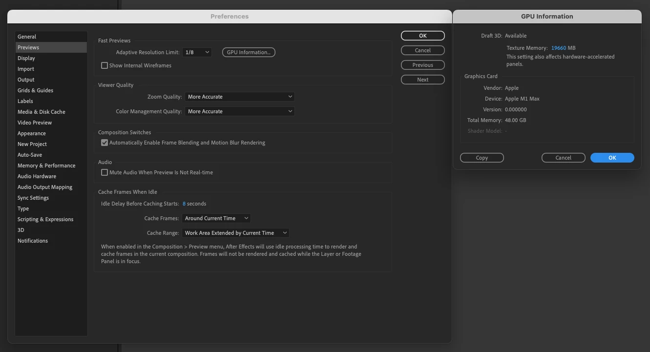 B) my Comp Settings, Project Settings, Preferences Settings are ideally aligned for use with an Apple M1 Max machine (by implication, perhaps I shouldn’t be approaching my settings now in the same way I did with a 16-core machine).