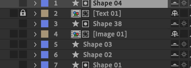 The first icon represents a layer type. Layer 1 and layer 4 are compositions. Video footage has a different icon than a still image. Each source file type has its own icon with the exception that all video footage (avi, mov, mp4) will have the same icon. The shape layer is always represented as a star.