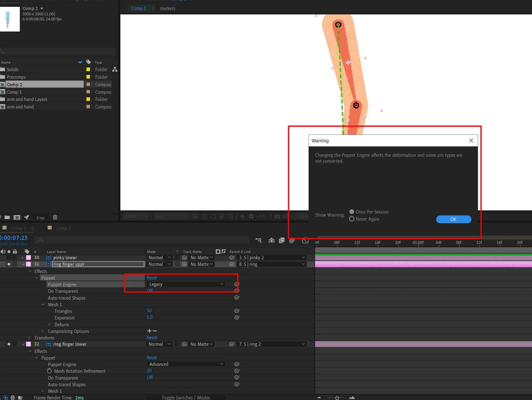 I am learning puppet rigging from a tutorial. Though the tutorial is from AE cc 18 but the application is same. I dnt understand why am getting this error msg every time am changing puppet engine from advanced in to legacy!