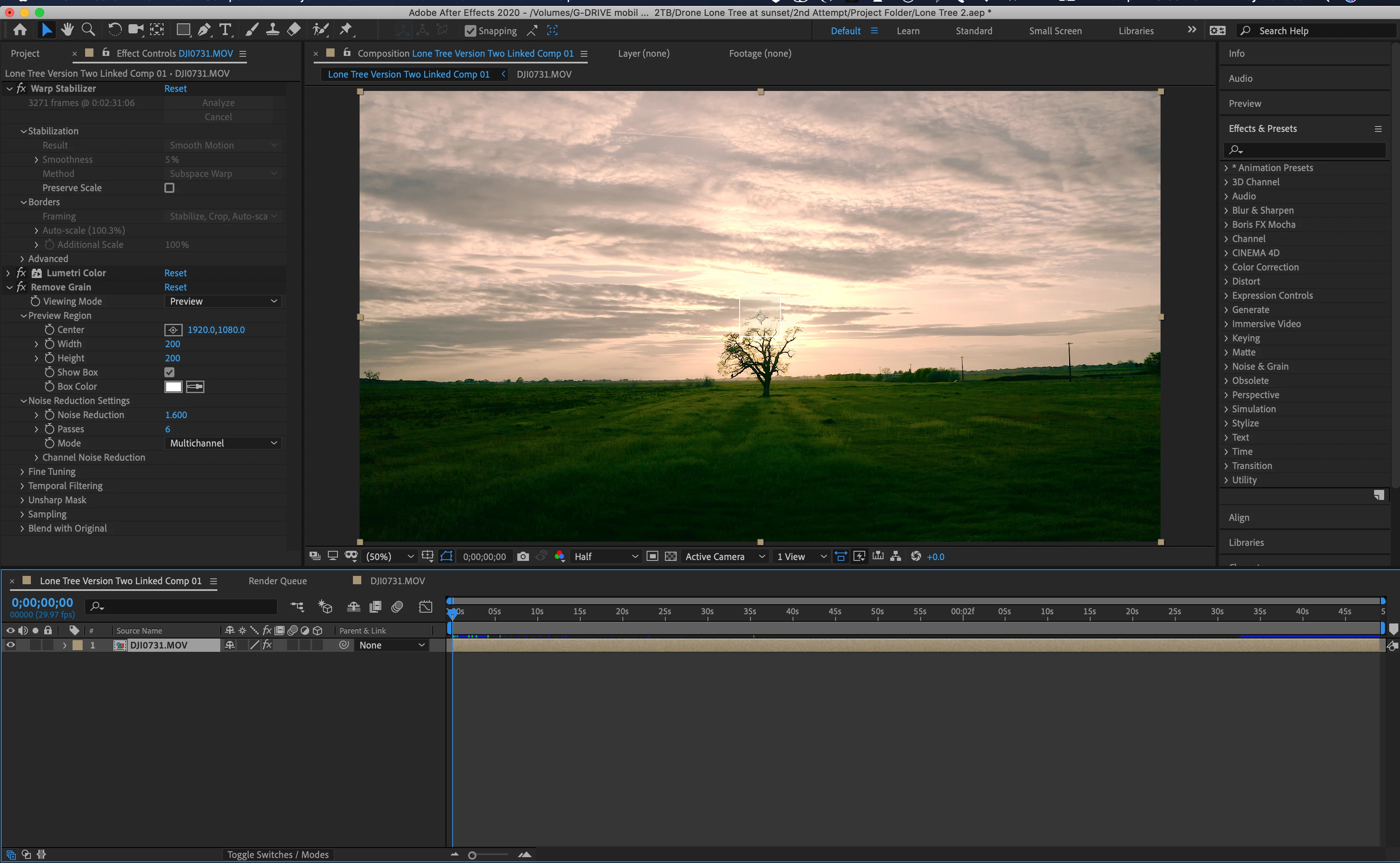 Here's a workflow hint for you. If you are going to use Warp Stabilizer on some footage it is usually more efficient to run it then pre-compose the layer and add your effects to the pre-comp. This eliminates the chance of having WS run again while it is rendering. An even better workflow, especially if you are doing some compositing that involves adding things to a scene using tracking tools, is to insert the objects into the scene, finalize the comp, then pre-compose the entire thing and run Warp Stabilizer on the whole comp. This will put the same distortions on the added objects that are on the original shot and make the composite better. Motion tracking will also work better on the original footage and if you run AE's camera tracker it will always work better on the original footage.