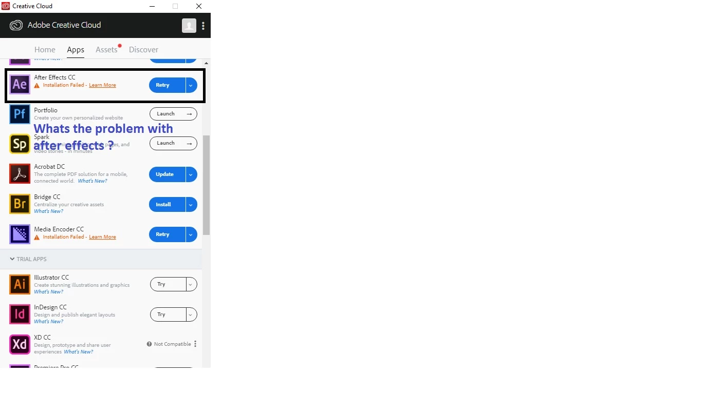 i am facing problems while installing update version of adobe after effect cc 2018. why this error occurrs while installing anybody please help me.