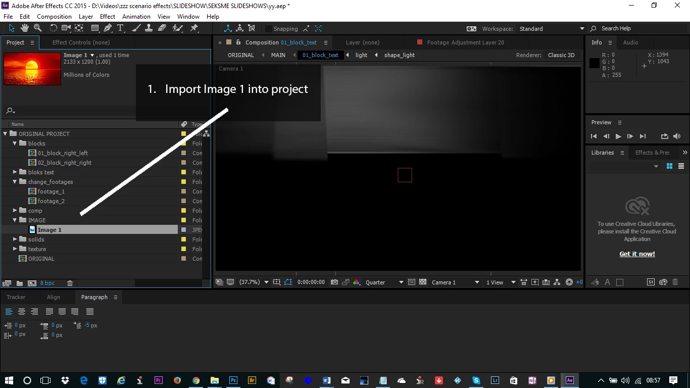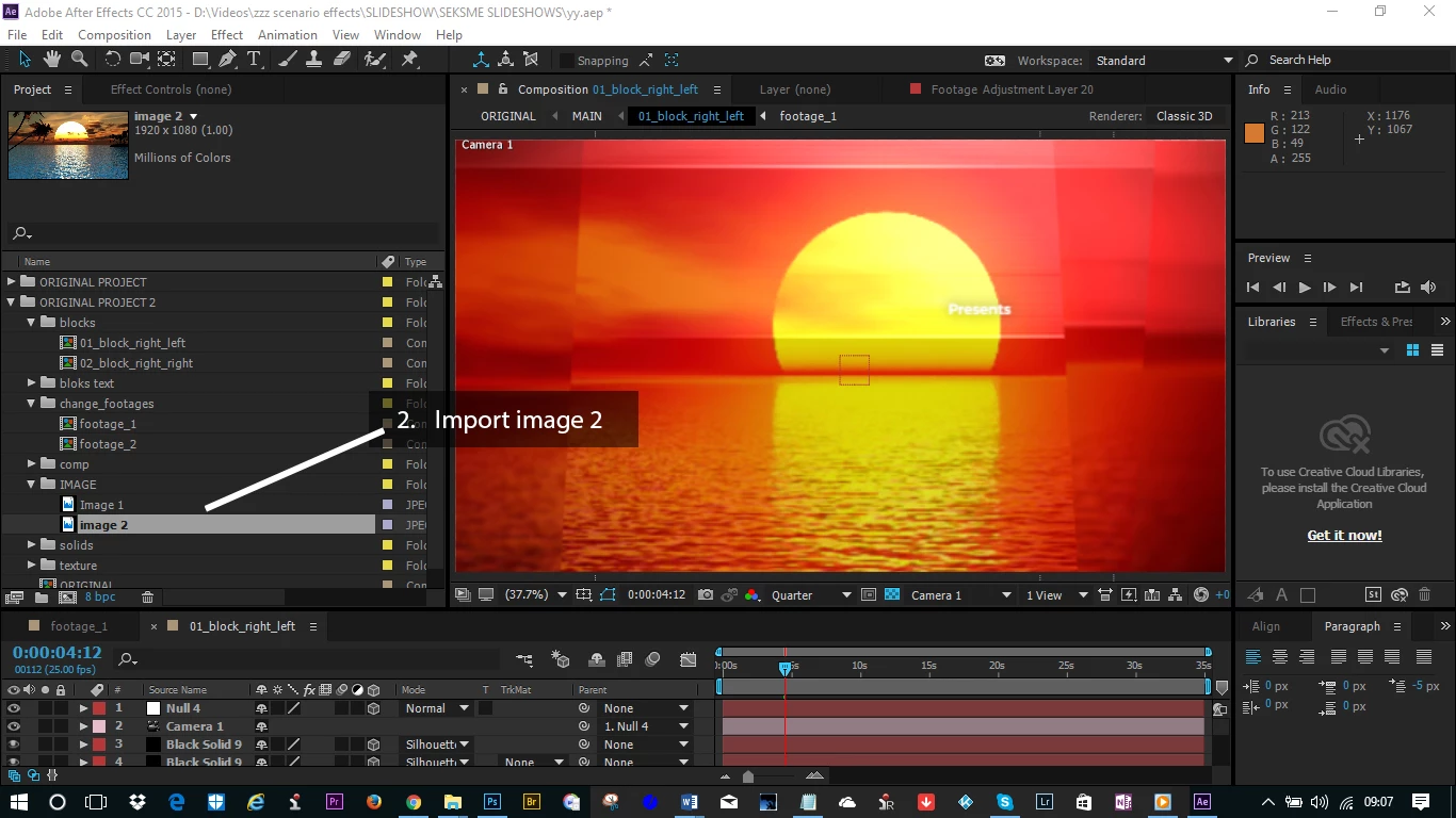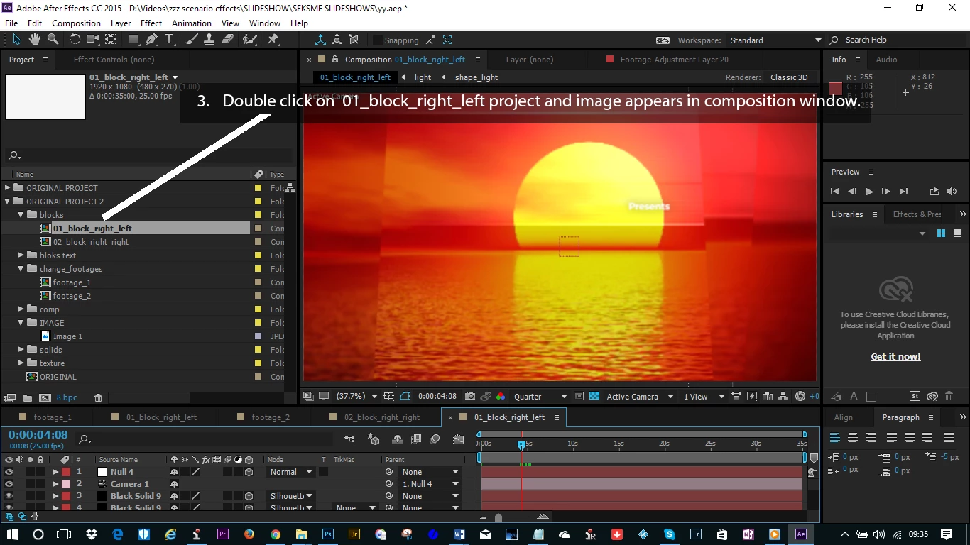 - Double click on 02_block_right_right project and NO image appears in composition window (in my other project I tried this process the screen was a solid white).