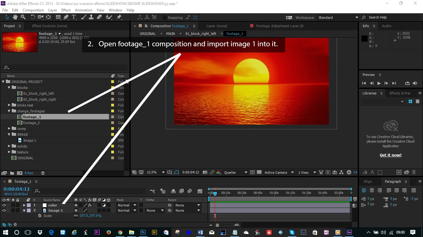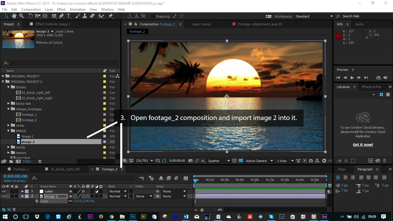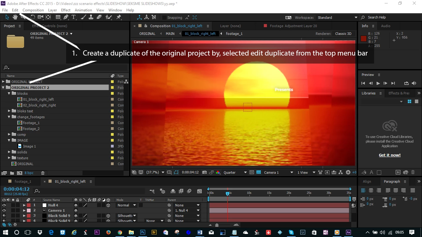 - Double click on 02_block_right_right project and NO image appears in composition window (in my other project I tried this process the screen was a solid white).