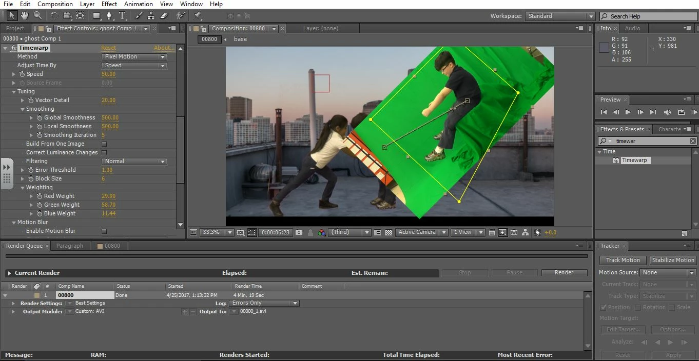 I an a newbie to Adobe After Effects. I work with students in an elementary school. I am using CC5. I layered some green screen video over another video, then masked out an area and used keylight to remove the green screen. I precomposed this green screen layer and tried to add timewarp effect to it. You can see in the picture below the keylight effect seems to be undone and can't be redone. I tried to render it out to see if it would be corrected and it was not. I have played with every setting I could find; I am at a loss. Help