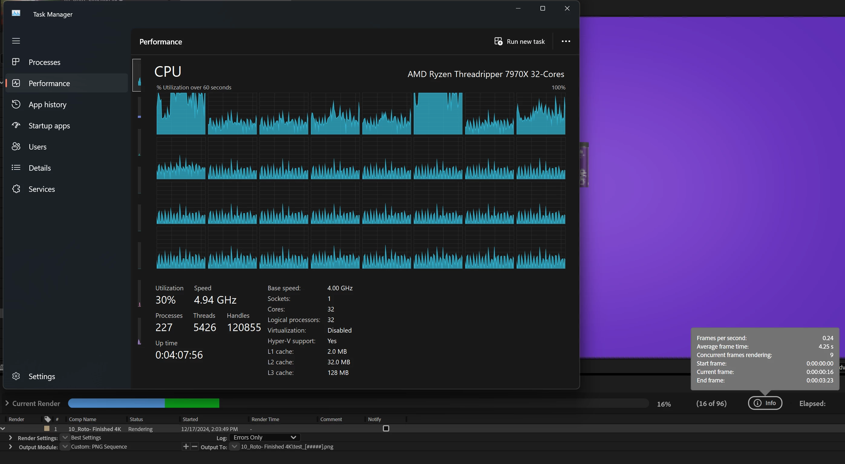 I am using the latest version of After Effects (25.1) on a computer with an AMD Ryzen Threadripper PRO 7975WX 32-Core processor, 256 GB RAM, and an RTX 4090. Despite having the 'Enable Multi-frame Rendering' option enabled, it is using only 1 core to render PNG image sequences. Is this normal? Are there any other settings that would allow me to better utilize all of these cores?
