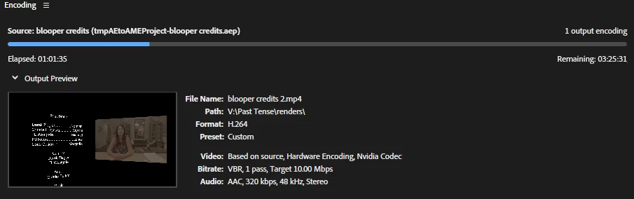 I am rendering a 1 minute credit scroll with an mp4 of bloopers next to it in AE2025 v25.3.2 (build 2). See image attached.