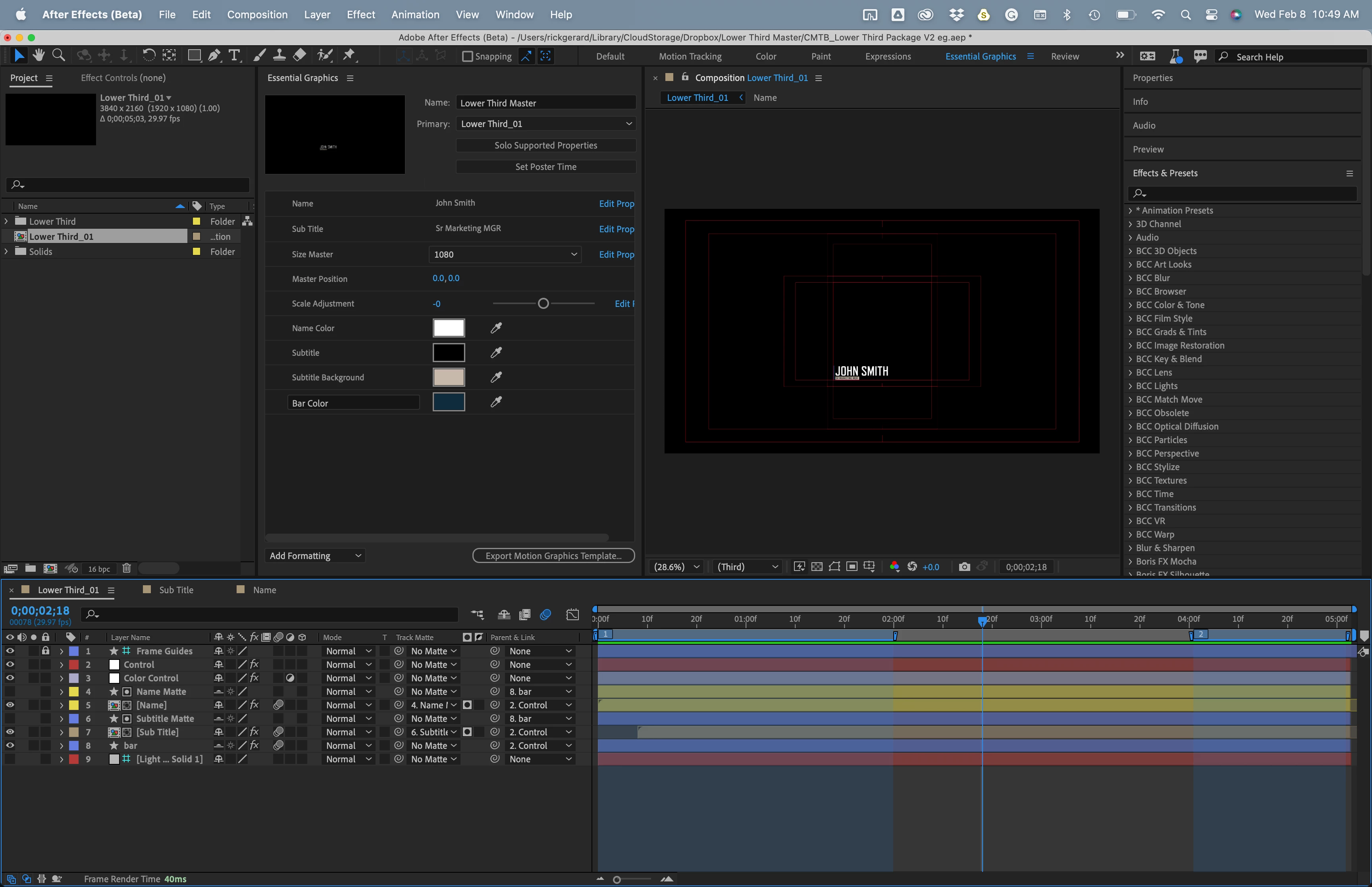 To set the stage,  I have a composition the creates title cards, with animated main titles in the center and name and rank in the lower third. This composition allows us to change out the names easily by making visible (or hiding) any layer.
