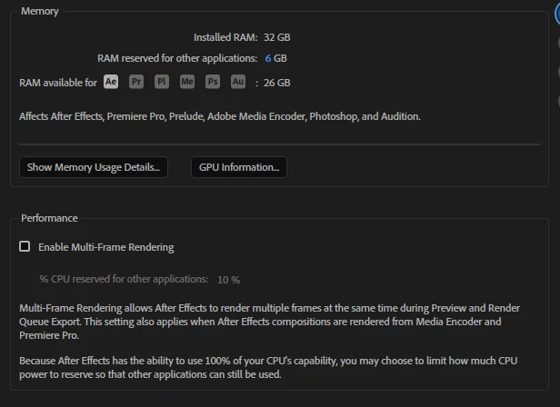 - I cant read computers but I've attached a screenshot of how much RAM is being saved/used for Adobe/AE