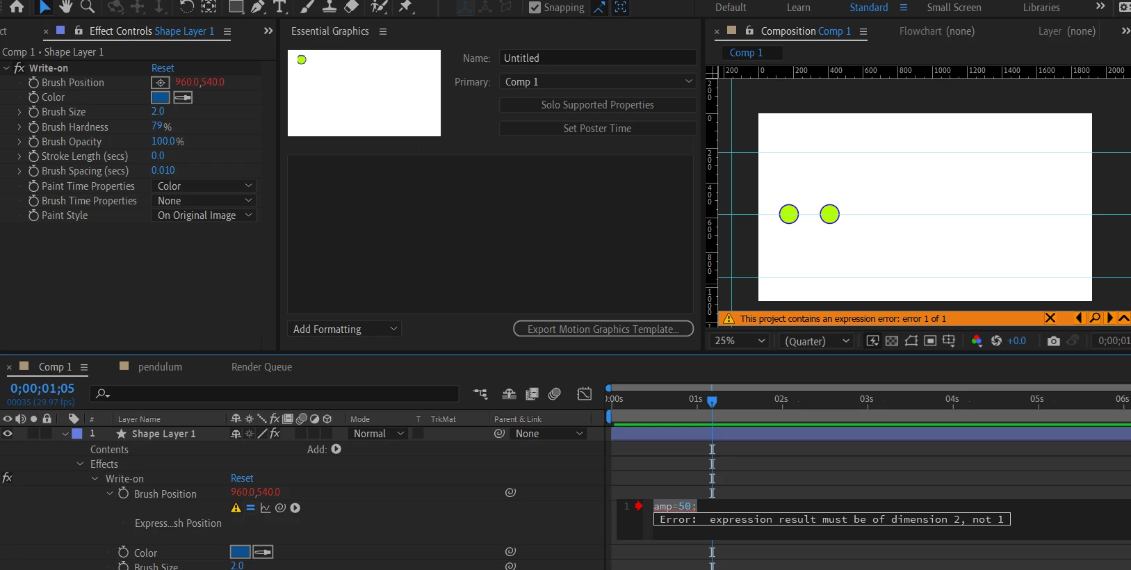 I add the effect to a new shape layer, alt+click the timer to open the expression space. Then I try to set a variable like 'amp=50' and get - 'expression result must be of dimension 2, not 1'