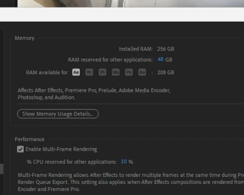Third Party plugins and Core After Effects share the memory limit as specified through “RAM available for” preference. In this latest build, we have reserved a small amount of memory specifically for the core After Effects functions, separate from the memory allocated for third-party plugins. This change is expected to have a positive impact on both render/playback performance and preview range, as it ensures that core After Effects functions are allocated sufficient memory to function properly, even when resource-intensive third-party plugins are being used.