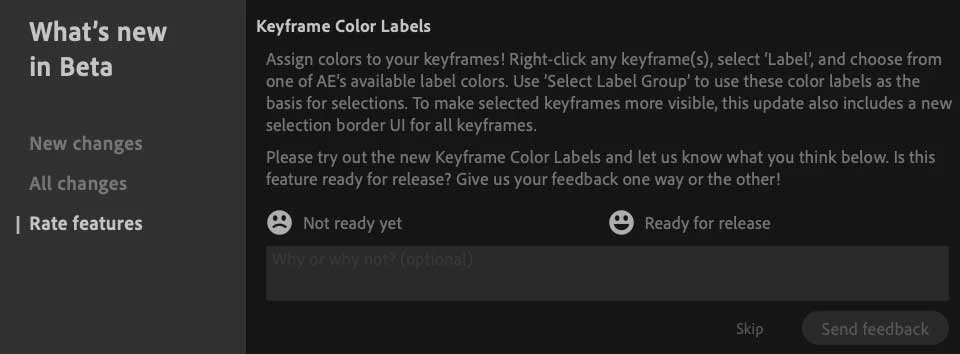 - In the What’s New in Beta panel that comes up, select ‘Rate features’ on the left. This gives you an option to say whether you think Keyframe Color Labels are either ‘Not ready yet’, or ‘Ready for release’. There is also space to leave any comments you may want to add: