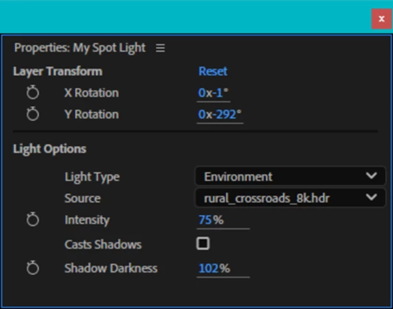 When the composition renderer is set to Advanced 3D, you can also choose the Environment Light Type and then pick from any HDR or EXR environment source layers from the Source drop down menu.