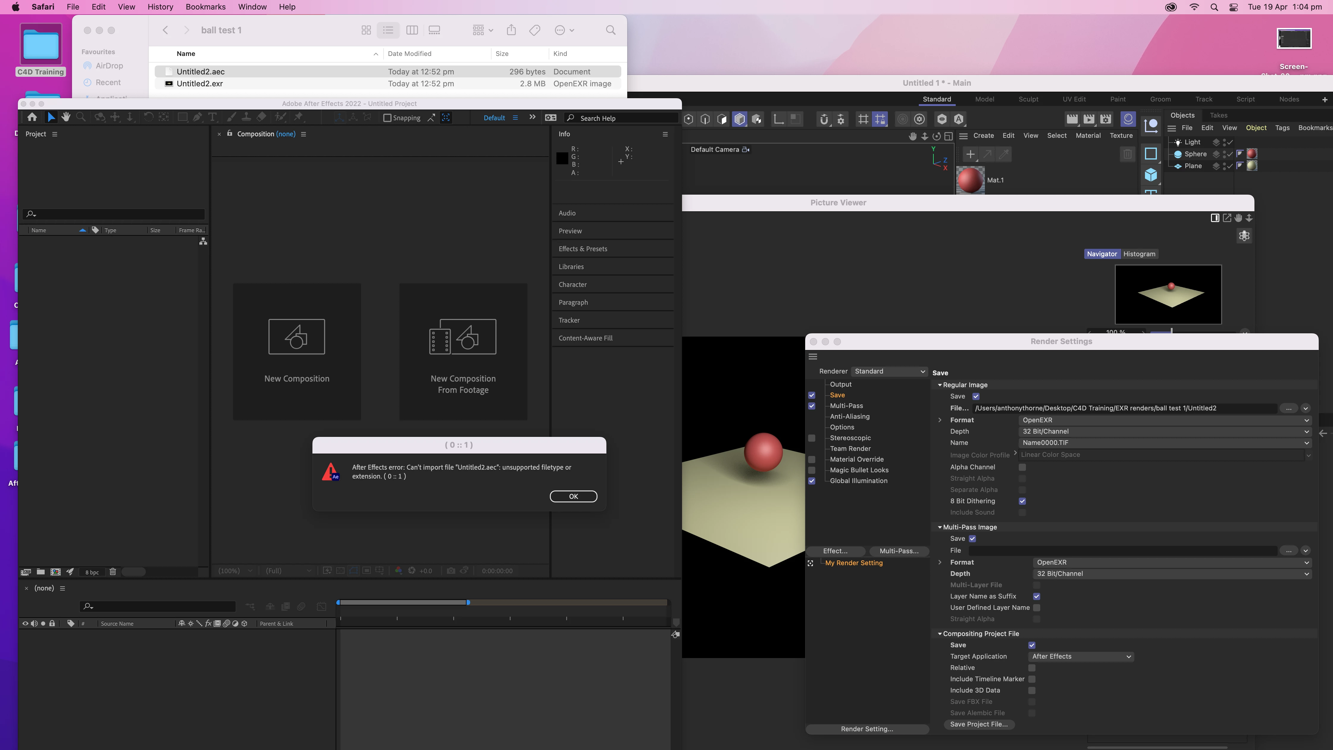 I'm doing very basic renders between Cinema 4D and AE. C4D lets me choose between rendering an OpenEXR file, or rendering the OpenEXR file with an accompanying aec. file that After Effects should be able to read. I'm doing a basic render (a sphere on a plane with a light) and rendering out the EXR file and the accompanying aec file. When I open After Effects - current Beta version 22.4.0, Build 41 - it can import the EXR file but the aec file is greyed out and unselectable.