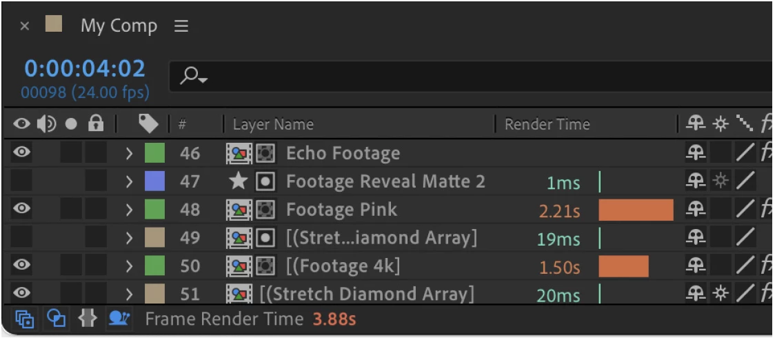 Today, we are excited to announce a new feature in After Effects called the Composition Profiler. The Composition Profiler is visible through a new timeline column, Render Time, that allows you to see how long each layer, mask, layer style, expression and effect took to render for your current frame.