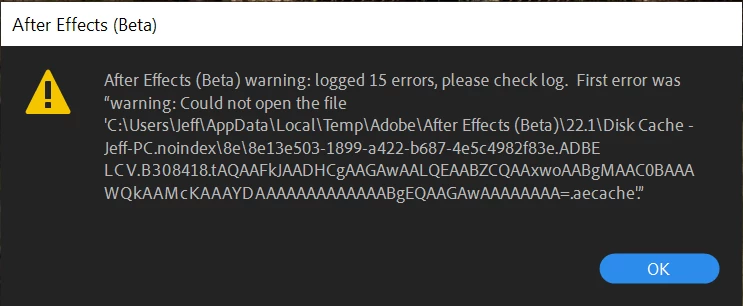 Rendering in AE Beta 22.1.0 (Build 24) on Windows 10. When exporting, After Effects incurs errors about not being able to find a series of .aecache files. Interestingly, it's always 5 errors per render. In this case, there were three files rendered, so 15 errors. Sometimes the render fails, sometimes it completes with logged errors.
