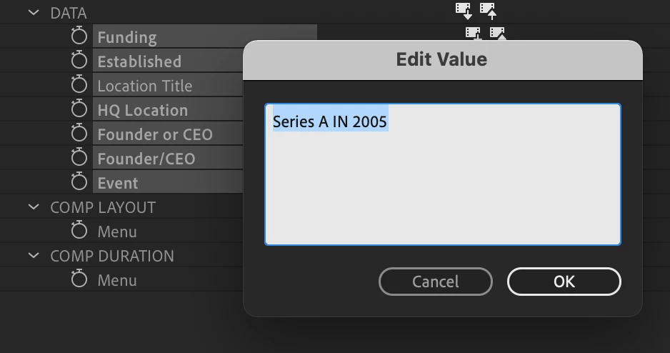• While workable the Edit Value workflow to edit source text is not intuitive and clunky in practice when taking advantage of EG instancing in AE. It would be better if we could get a EG like editing panel for making instance comp changes. It feels like a step backward to have to drill down into the instanced layers Essential Properties and edit specifically each text element one at a time when we just created a clean and unified EG Panel with text boxes. If this is my ignorace in implementing the feature in AE I would welcome additional guidance.
