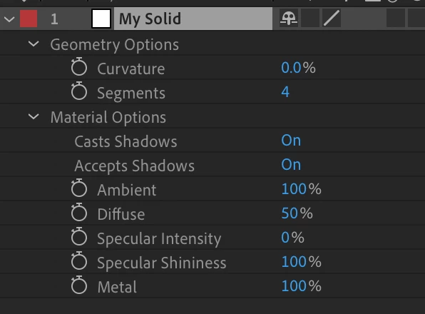- If you want your 3D layer to match the look of the 2D version as closely as possible, turn Ambient and Diffuse to 100 and turn down Specular Intensity, Specular Shininess and Metal to 0.