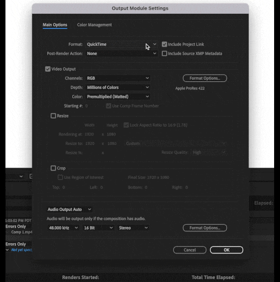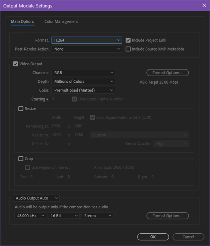 If you need more control, you can customize the H.264 settings by clicking on a Format Options button in the Output Module Settings dialog. Not every option that is available in AME is exposed inside AE, and some settings such as resolution, frame rate, color management, are still set from AE’s Render Settings or Output Module Settings, but there should be enough to tweak for most users.