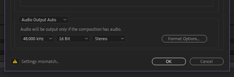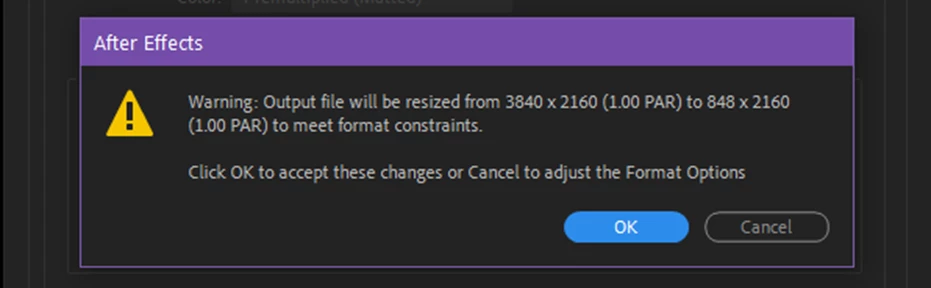Sometimes there will be a mismatch between AEs render / output settings and what is supported by the H.264 format. In that case, clicking OK after editing the H.264 settings will result in a warning dialog: