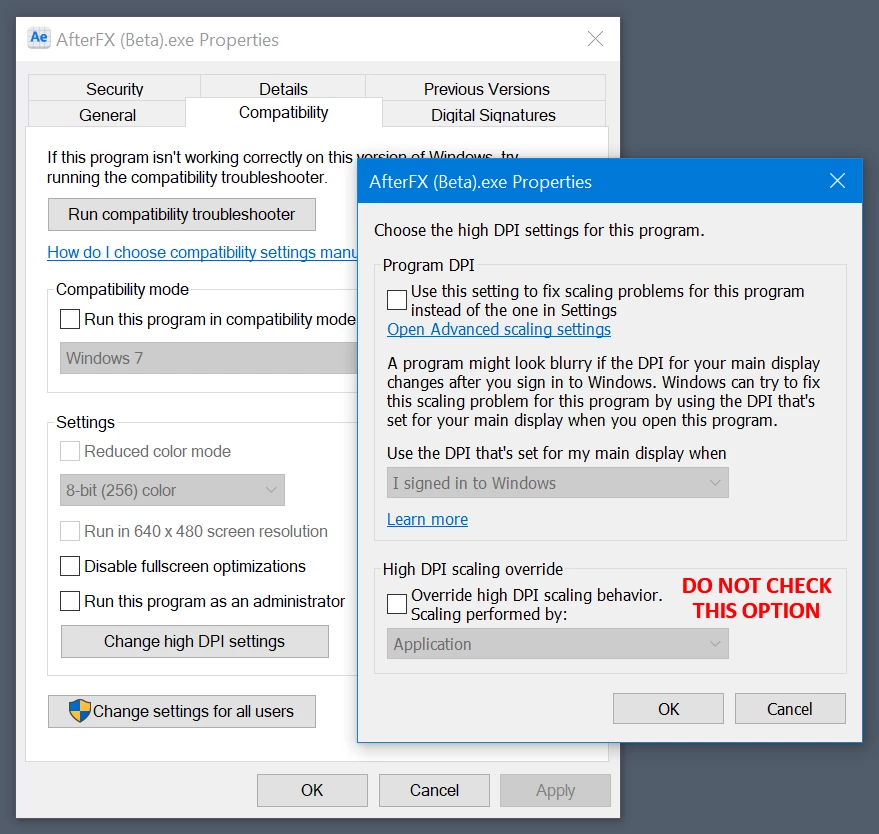 Also, on Windows, if you previously overrode the high DPI scaling behavior of the After Effects app, please disable it (i.e., use the default setting) to test this improved multi-monitor scale support.