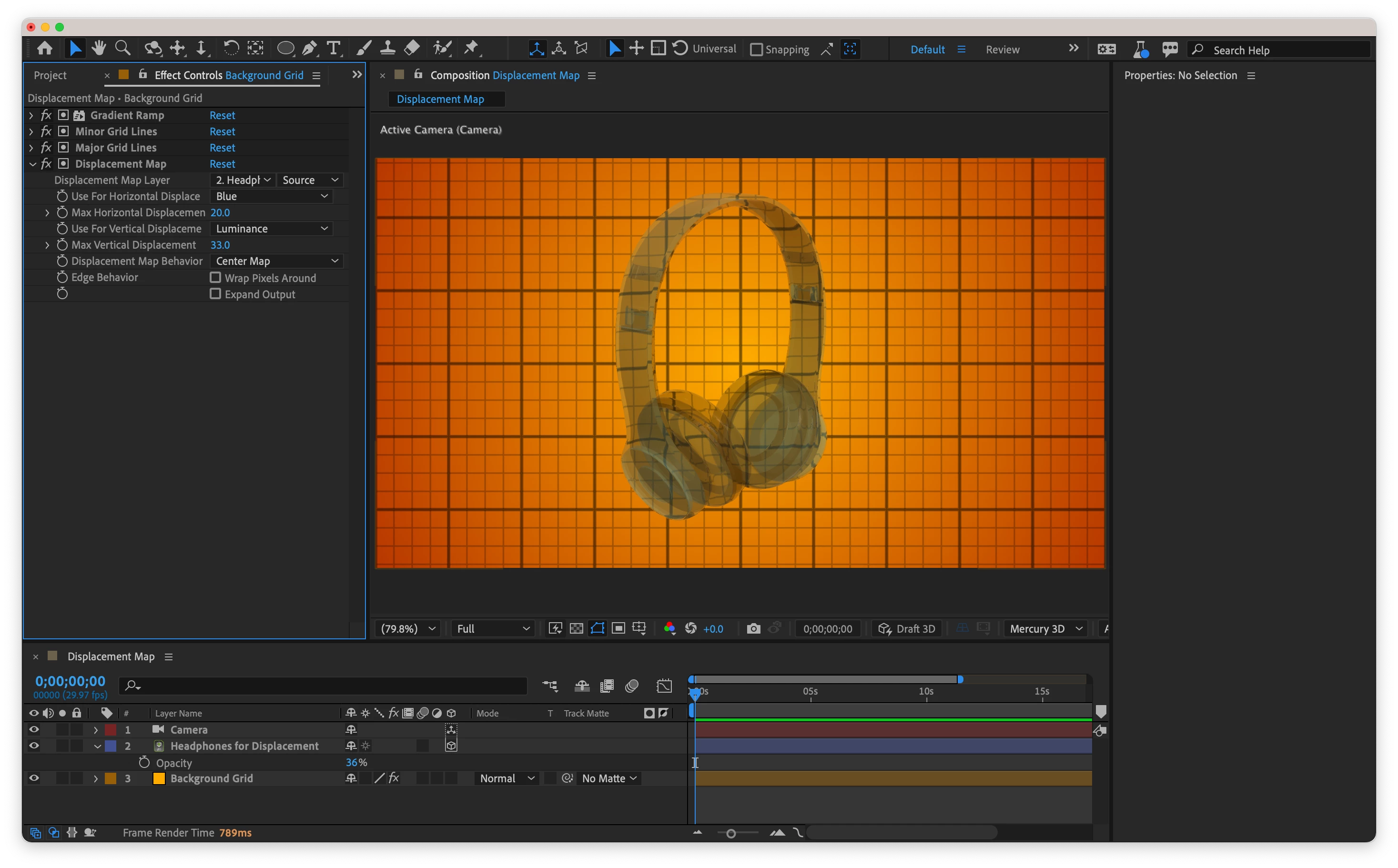Note that Displacement Map is applied in layer space and the entire rendered frame is used as the map, so you may find that there’s misalignment if your layer size is different.