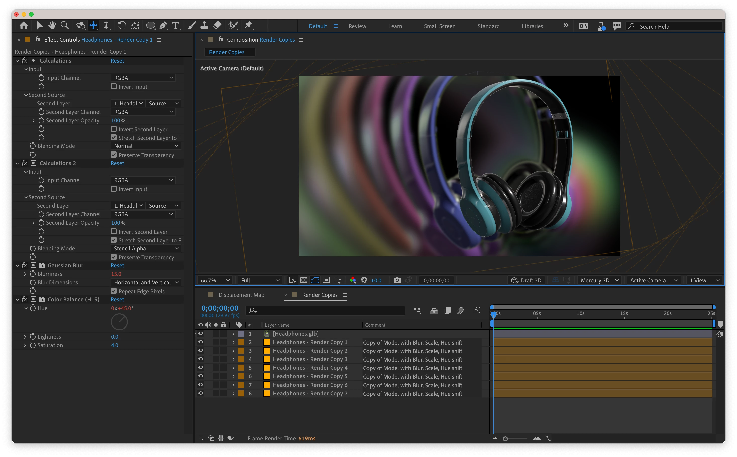 This layer now has a live copy of your rendered model in the comp frame, ready for you to transform, apply effects to, or composite with other layers – including other 3D models. Rotate your model layer or camera and the copy in this layer will update instantly. You can also duplicate the layer to create multiple matching copies of your model, as if it was pre-comped.