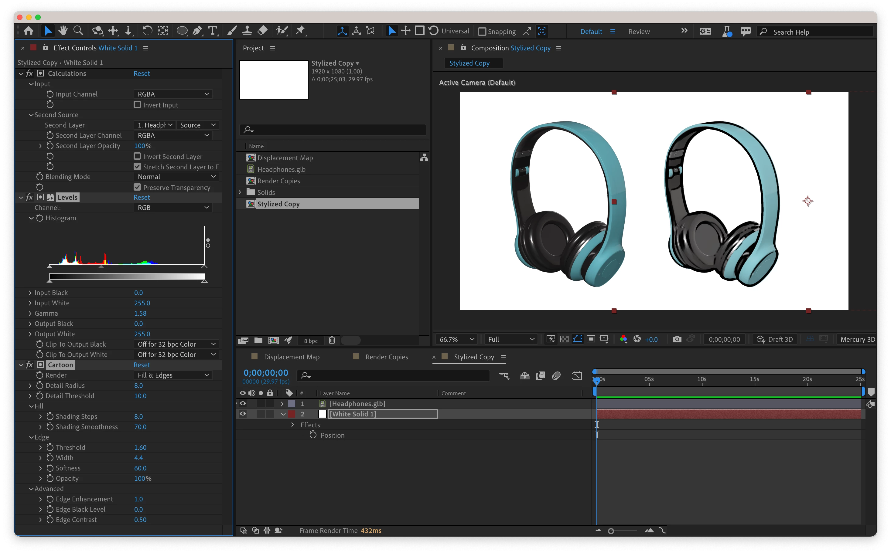 If you copy your render layer, as above, it just becomes a frame you can then stack any other effects in your entire After Effects installation on top of that render copy. Change colors, blur details, add contrast or texture, lens flares, even use Cartoon to add a toon shade look.