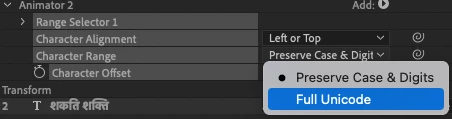 Just to review, the Range Type Preserve Case & Digits defines a set of Unicode range groups whereby when After Effects adds a positive or negative offset to the base character it is animating the resulting Unicode character is wrapped around so it stays within the same Unicode range group as the base character.