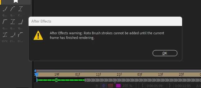 when i try to paint strokes with rotobrush it doesnt work, it just leaves a purple outline around the video and says "after effects warning: roto brush strokes cannot be added until the current frame has finished rendering