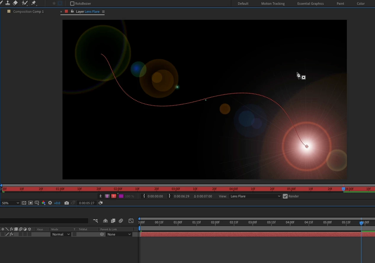 1. Create a solid, add Lens flare, open Layer Panel, set a keyframe for Flare Center, move down the timeline, set another keyframe, make sure Lens Flare is selected to render.